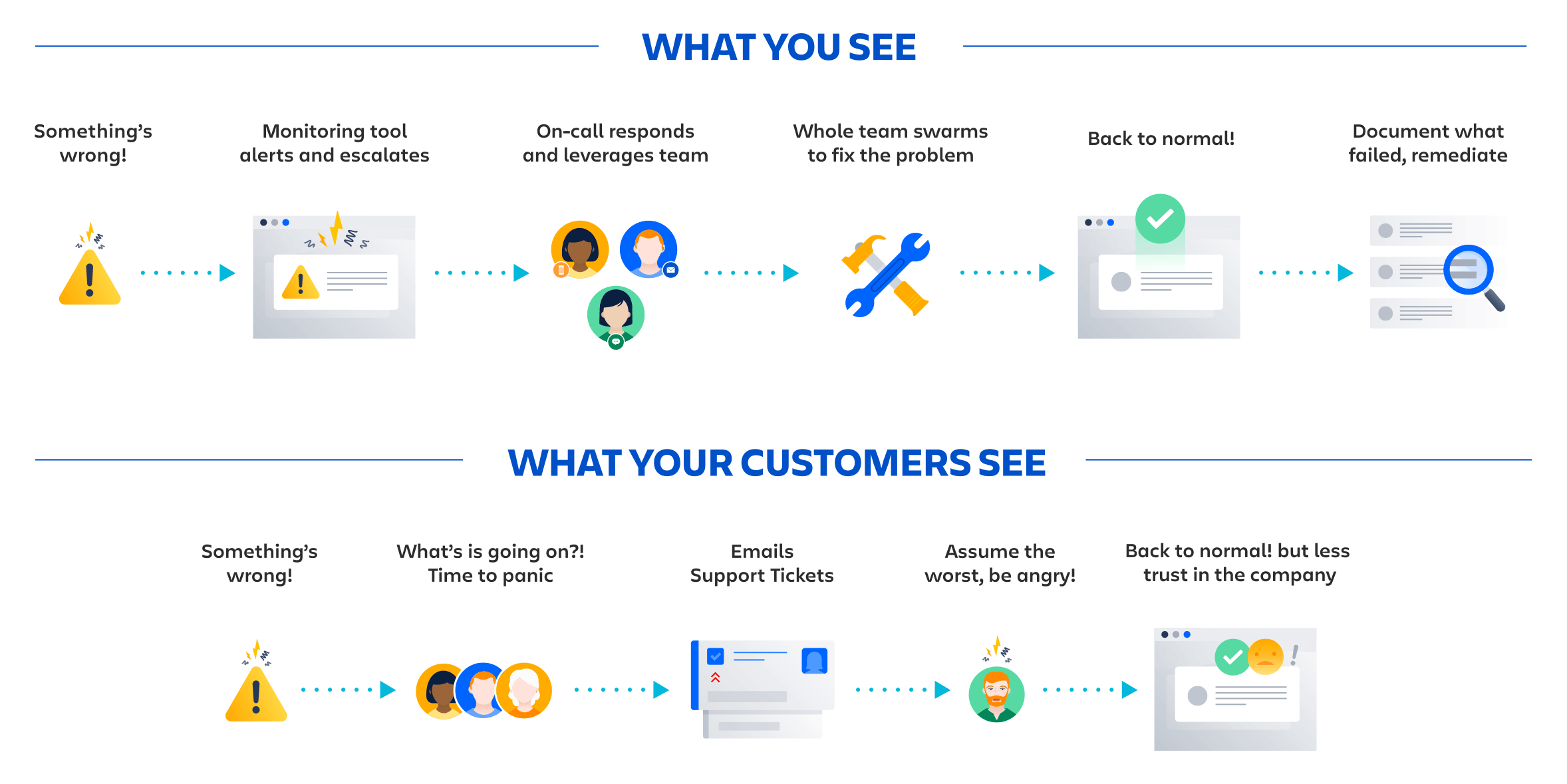 Vos clients s'y intéressent. Vos collègues s'y intéressent. Vous devriez vous y intéresser. Un temps d'arrêt mal géré peut être une très mauvaise expérience pour vos clients et vos équipes, et affecter vos résultats. Certains de vos clients peuvent craindre que cette expérience ne soit pas un cas isolé et se tourner vers un concurrent. Vous perdrez de futurs clients en raison du manque de confiance. Le moral de l'équipe peut en pâtir et entraîner une baisse de productivité. Et vous pouvez dire adieu à la bonne publicité par le bouche-à-oreille.