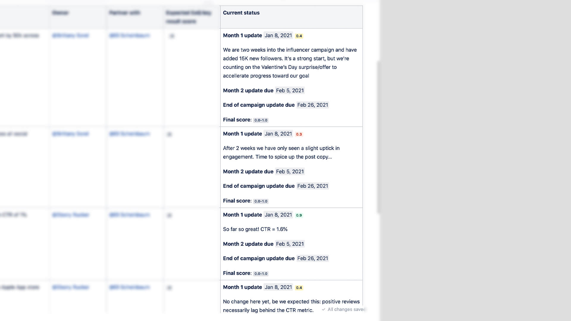 Salva gli OKR in una posizione in cui il tuo team e gli stakeholder possano trovarli facilmente. Termina il trimestre assegnando a ogni risultato chiave un punteggio finale. Utilizzando una Retrospettiva, rifletti sui tuoi OKR e su cosa puoi migliorare alla successiva impostazione.