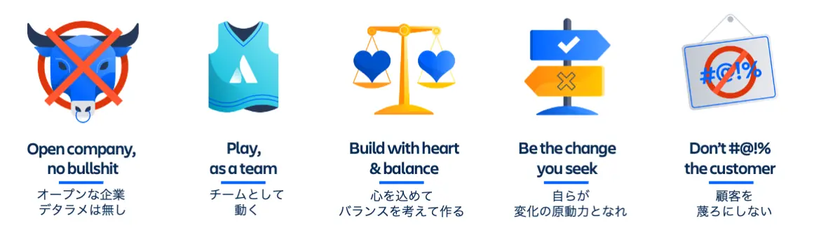 アトラシアンでは、創業20周年を迎えた今も変わらない、組織そのものを示す以下5つのコーポ―レートバリューを掲げています。出荷するあらゆるソフトウェアの機能、発売するすべての製品、すべての投資は、あらゆるチームの可能性を解き放つことに集中しており、すなわち、これらは、フライホイールを強化する価値観でもあります。