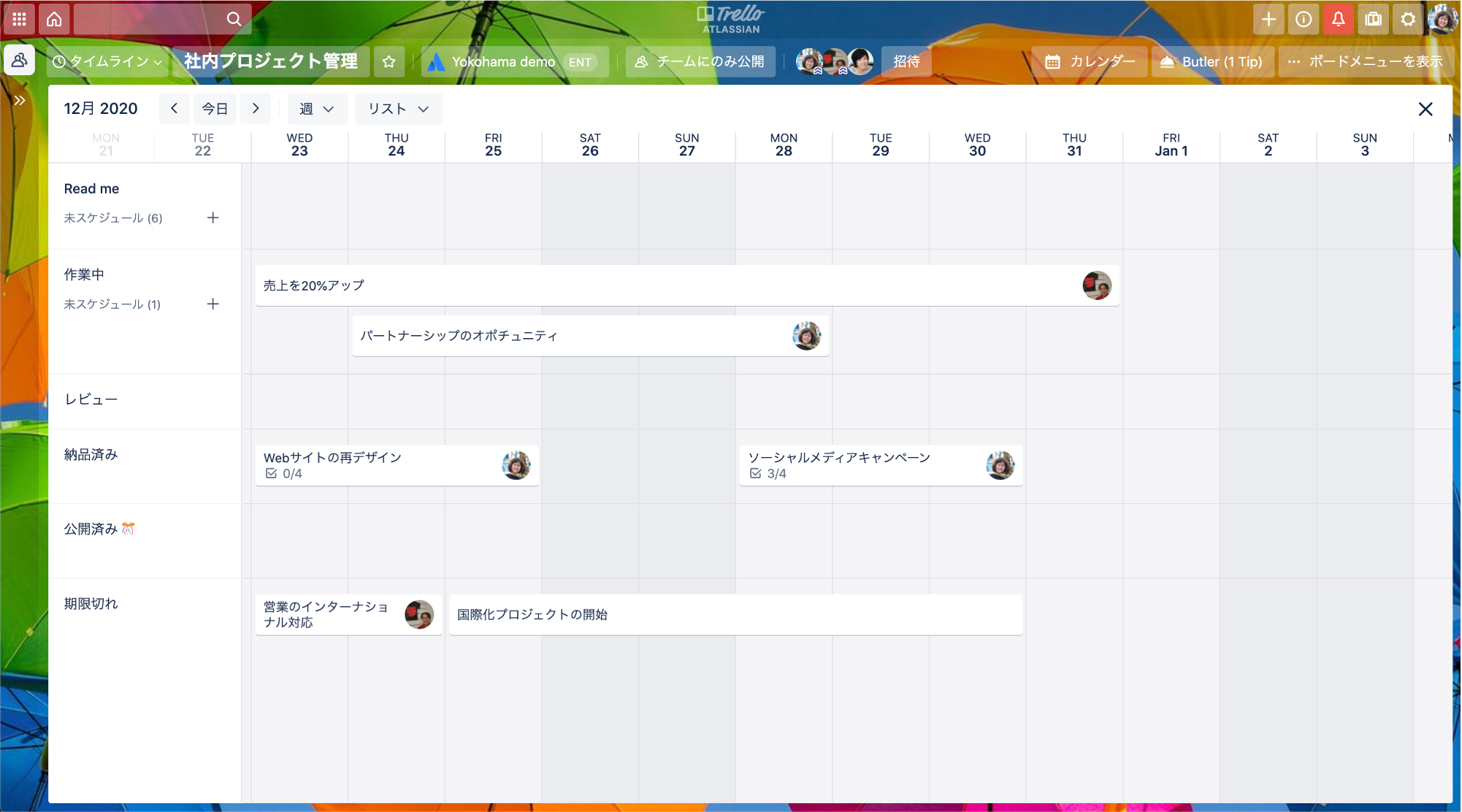カレンダービュー:進行中の作業、今後の期限、特に時間管理が必要な個々のタスクを追跡するために最適な機能です。