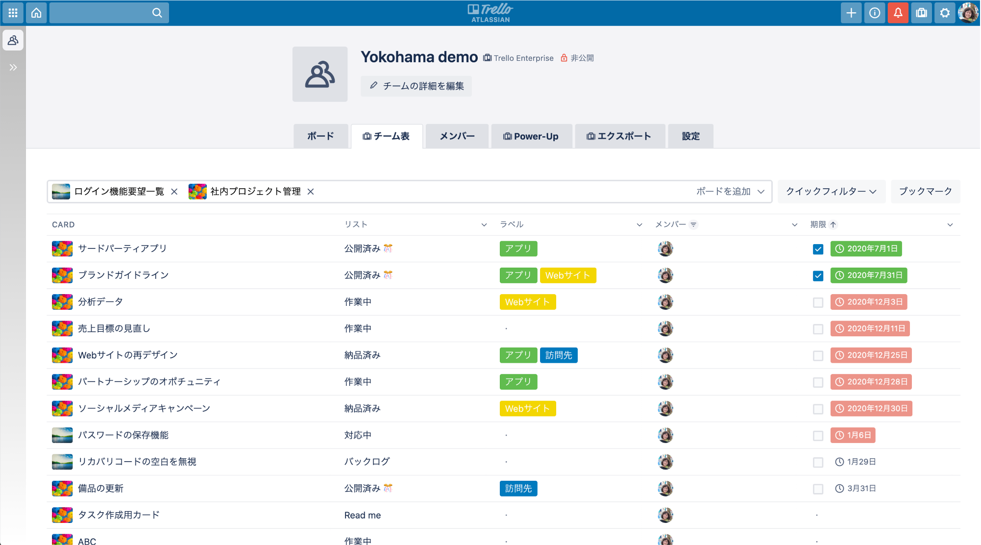 テーブルビュー:規模の大きな業務が複数のチームやボードにまたがって進む時、またはボードが単に情報で過負荷になる場合、テーブルビューはデータを便利なスプレッドシート型のリストとして表示することができます。