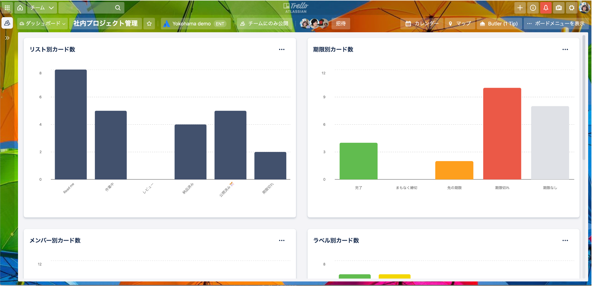 ダッシュボードビュー:ダッシュボードは、チームが、期日、割り当てられたカード、期限、割り当てられたカード、リストごとのカードなどの主要な基準を用いてプロジェクトの全景をグラフ形式で視覚化できるため、チームがどのように機能しているかを把握することができます。