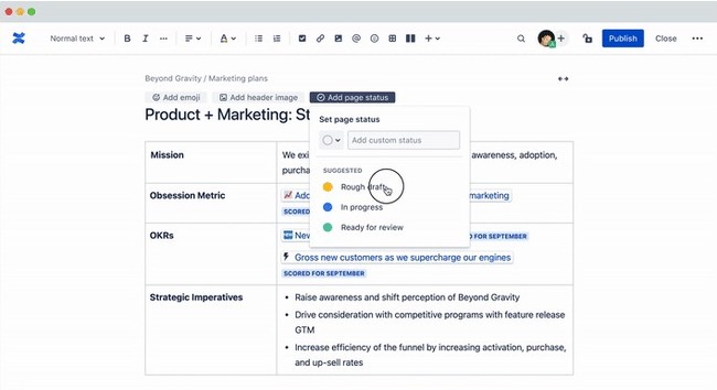 ページのステータス:各ページに、情報のステータスを明示する機能がつきました。ステータスは、標準で提供されているものの中から選ぶことも、独自のステータスを設定することもできます。
