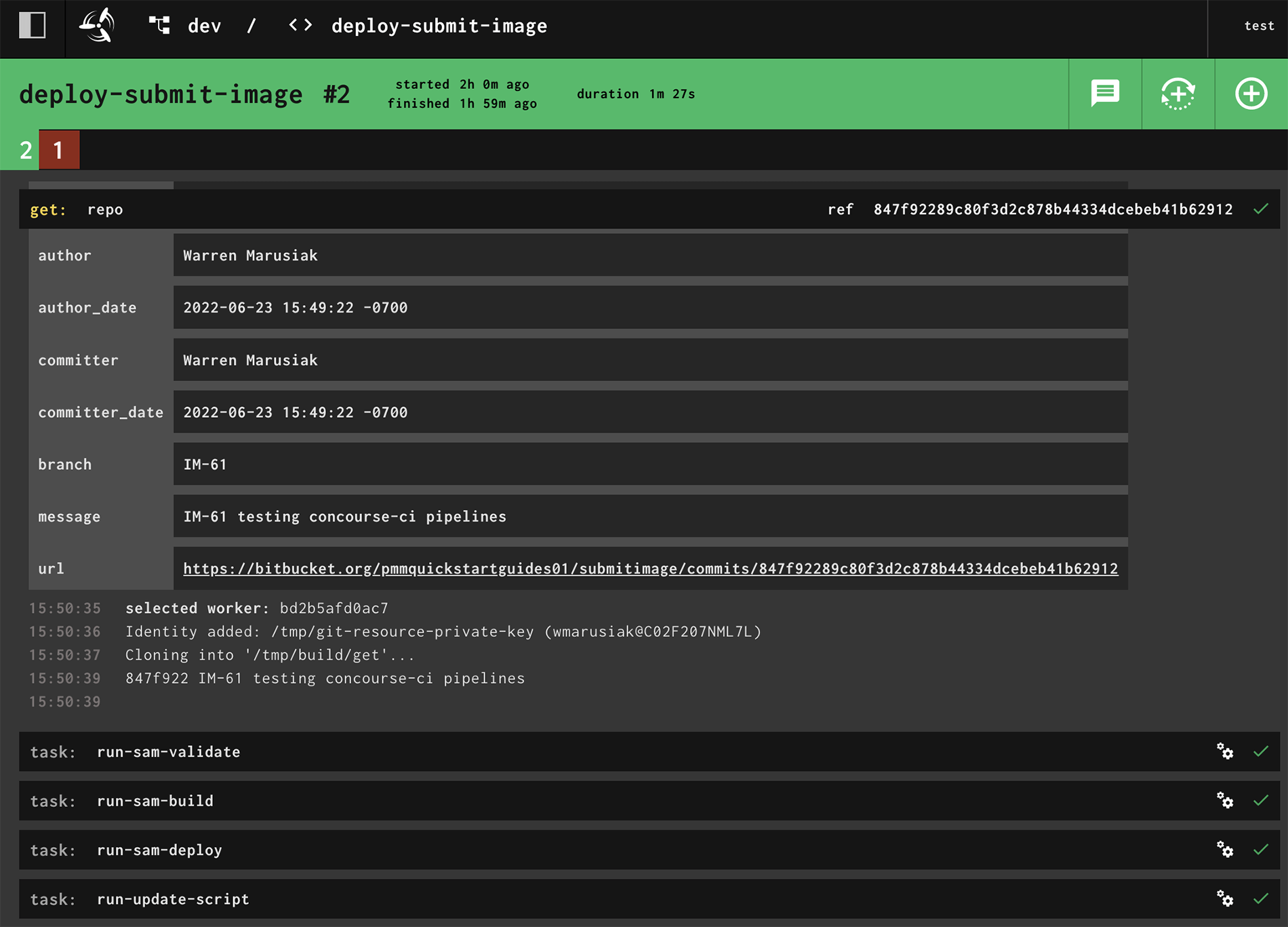 Let op dat er een stap is om de SubmitImage-repo te verkrijgen en dat de branch GB-61 is. Let ook op dat er run-sam-validate, run-sam-build, run-sam-deploy en run-update-script stappen zijn.