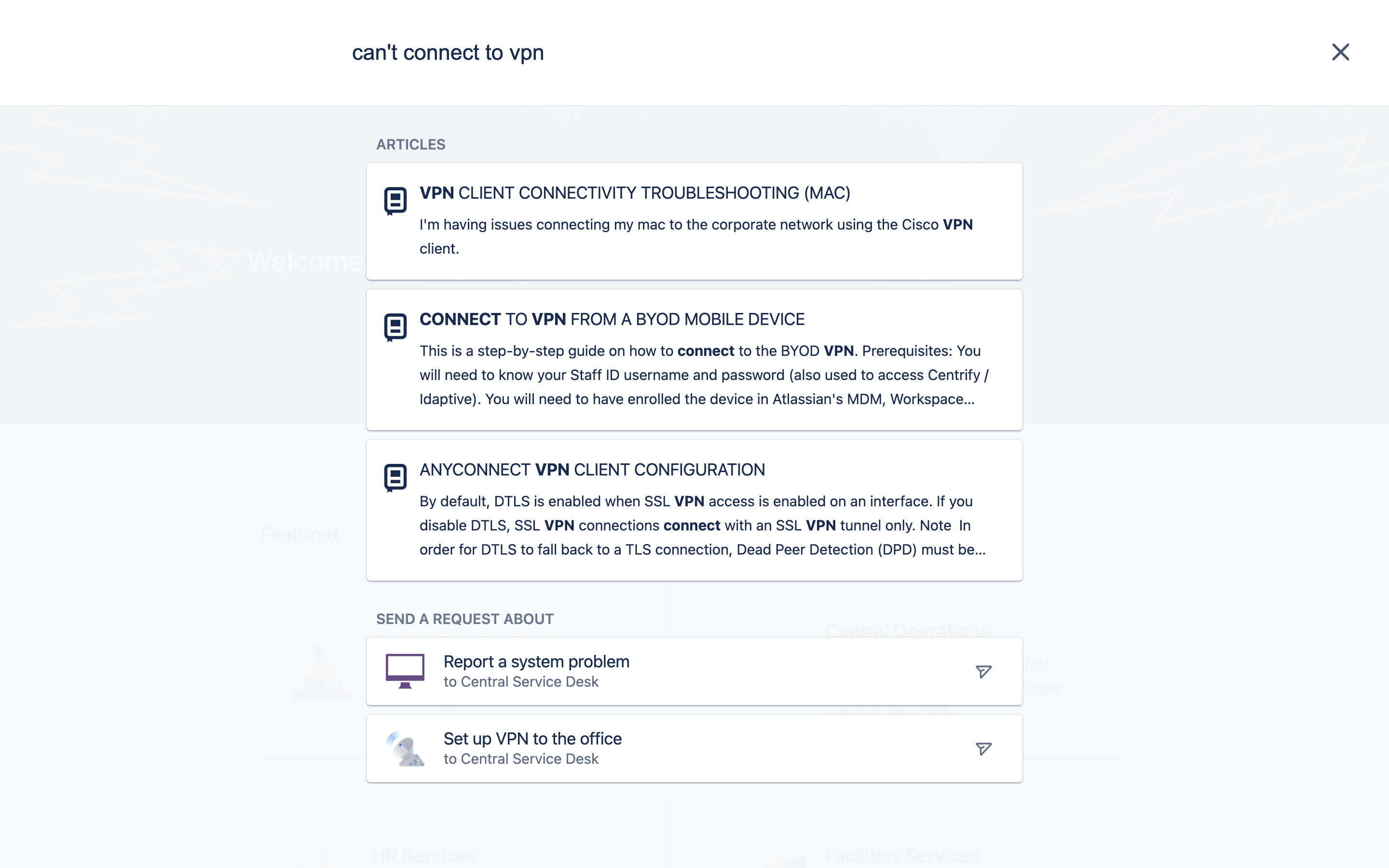 Een krachtige werkwijze voor kennisbeheer stroomlijnt serviceaanvraagwerkwijzen voor IT en andere serviceteams. Zo kunnen medewerkers bijvoorbeeld een serviceaanvraag indienen over een issue met VPN-toegang. Wanneer ze het helpcentrum van Jira Service Management bezoeken, voeren ze de beschrijving van hun service-issue in en worden relevante artikelen automatisch uitgelicht. Dit kan direct antwoorden bieden en helpt werknemers problemen sneller (en vaak makkelijker) op te lossen in plaats van te wachten op support.
