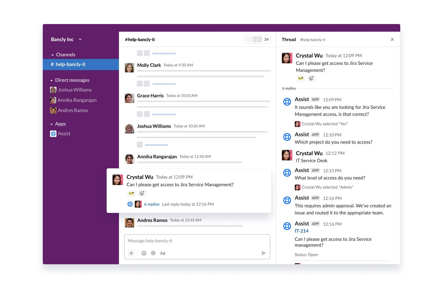 You’ll need to create several Slack channels (or use existing ones by inviting the Assist app to the channel):