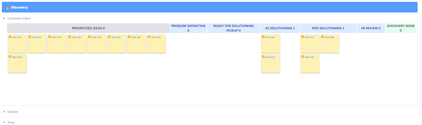 交付详细信息:用户可以使用 Jira 小工具(如图所示)深入了解用户故事、功能和长篇故事(图中未显示),以及有关新故事、功能等内容的想法